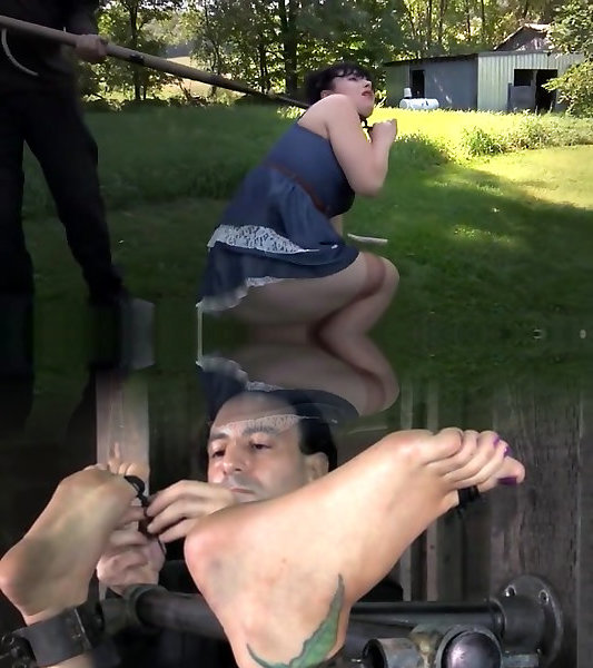 She is roped up to the prison cell and plaything screwed