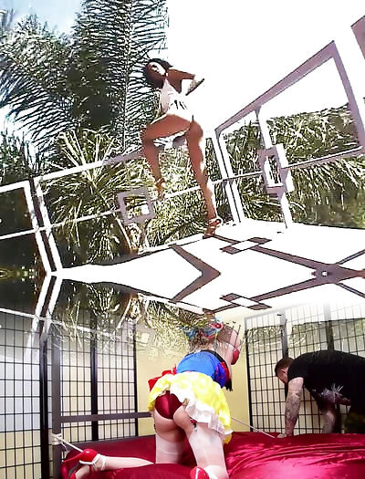 Lesbians strapped by a de-robe pole