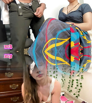 Tamil MILF Stepmom Stuck Under Bed with white saree & dark-hued half-top, when she cleaning under bed then stepson fuck her